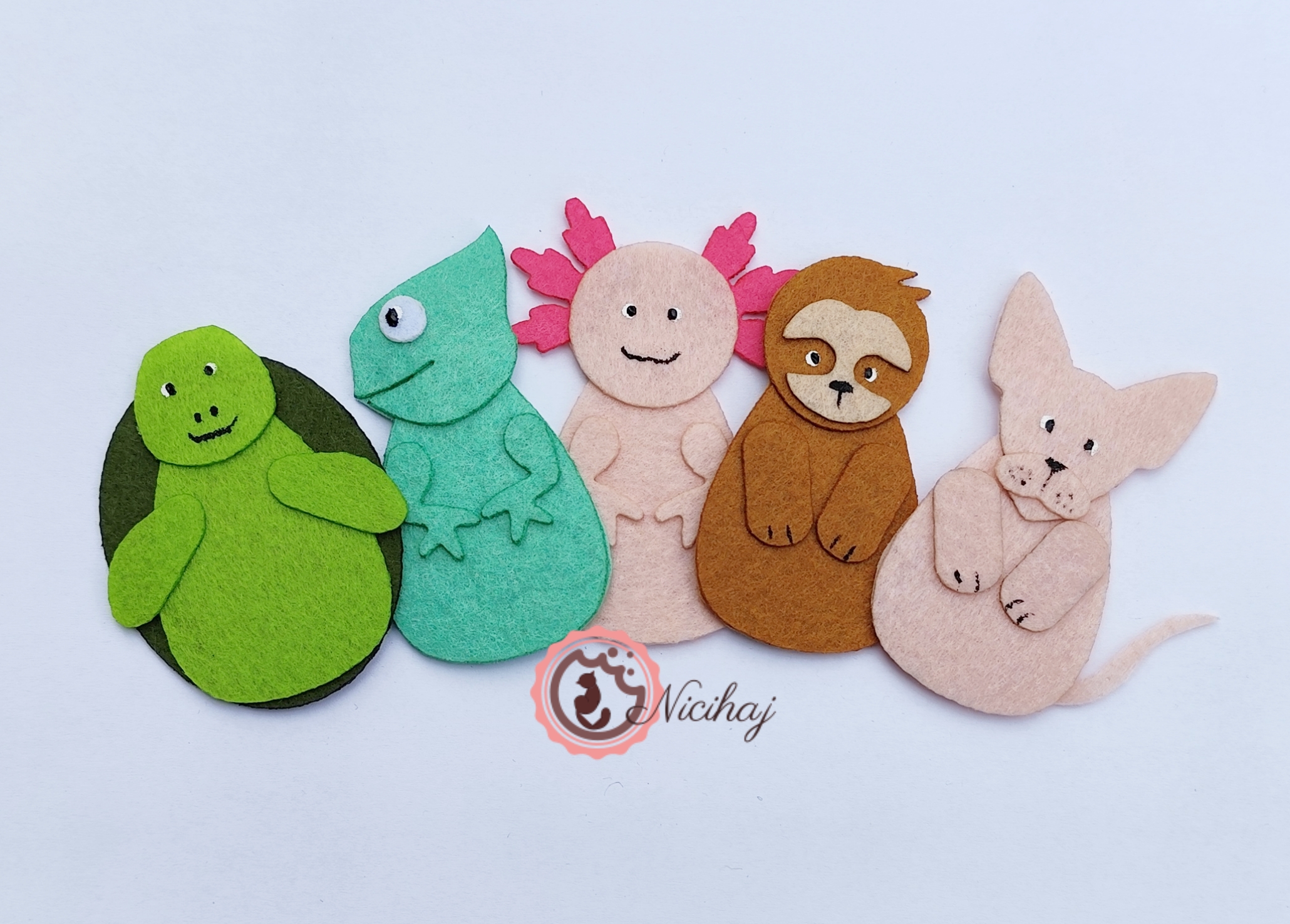 Az exotikus állatok ujjbáb szett tartalmaz 5 darab ujjbábot. ( teknősbéka, kaméleon, axolotl, lajhár, kopasz cica)