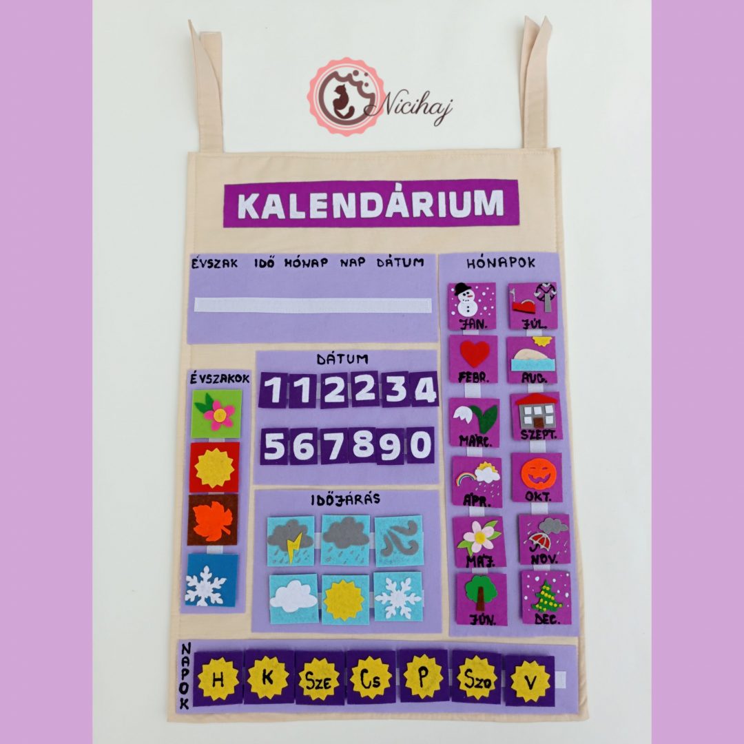 Textilből és levehető filc részekből készült kalendárium, ami játszva segiti a gyerekeket megtanulni a naptár használatát. Ennek segitségével minden nap be tudják állitani az aktuális dátumot, hónapot, évszakot vagy épp az időjárást is.