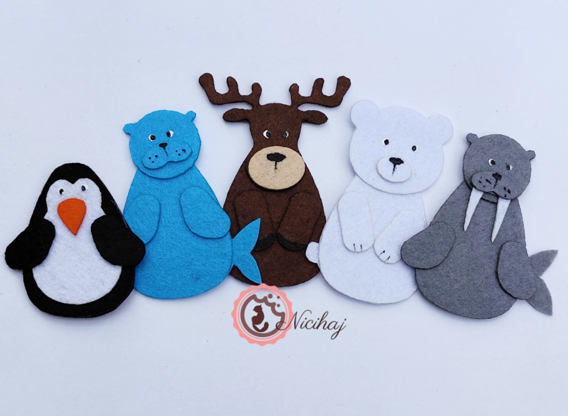 A sarkvidéki állatok ujjbáb szett tartalmaz 5 darab ujjbábot. (pingvin, fóka, jávorszarvas, jegesmedve, rozmár)